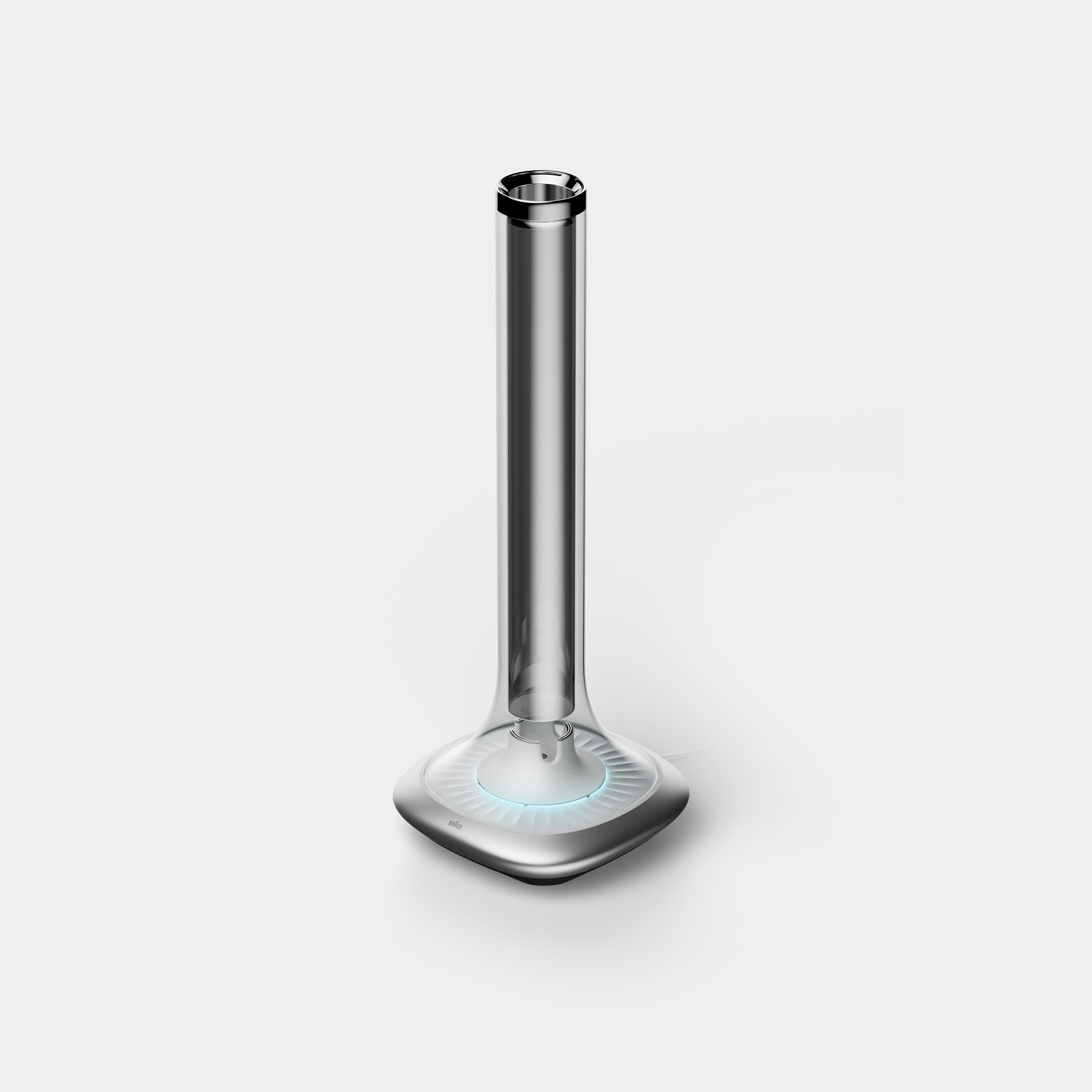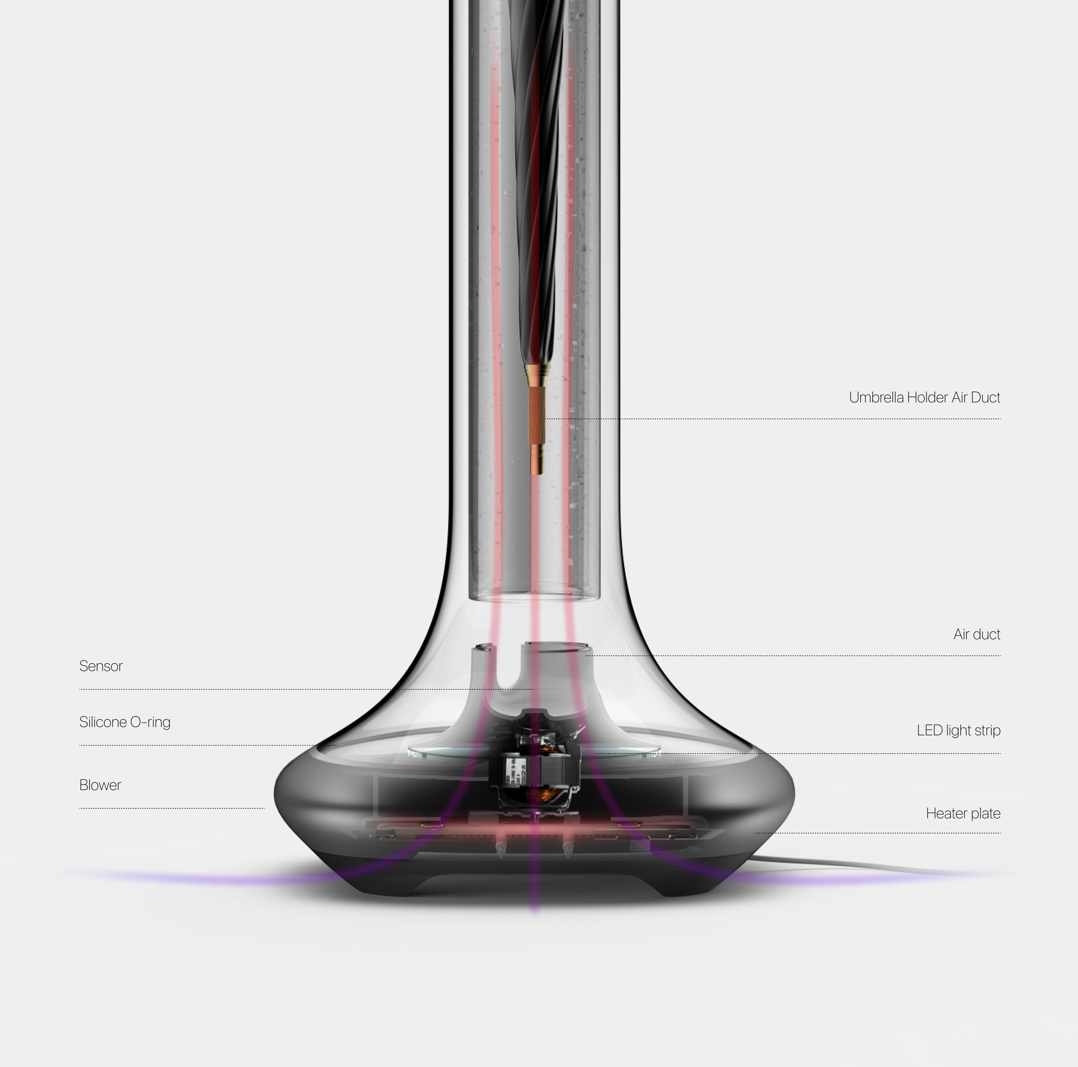 产品整体为向上收束的圆柱形,高度为960mm。下方为风机,使用时将雨伞插入吹出热风将伞烘干,剩余的水流聚集在底部透明外壳的水箱中。顶视图中间为检测雨伞的传感器,并有一圈指示灯指示工作状态。底面为进风口和供电。